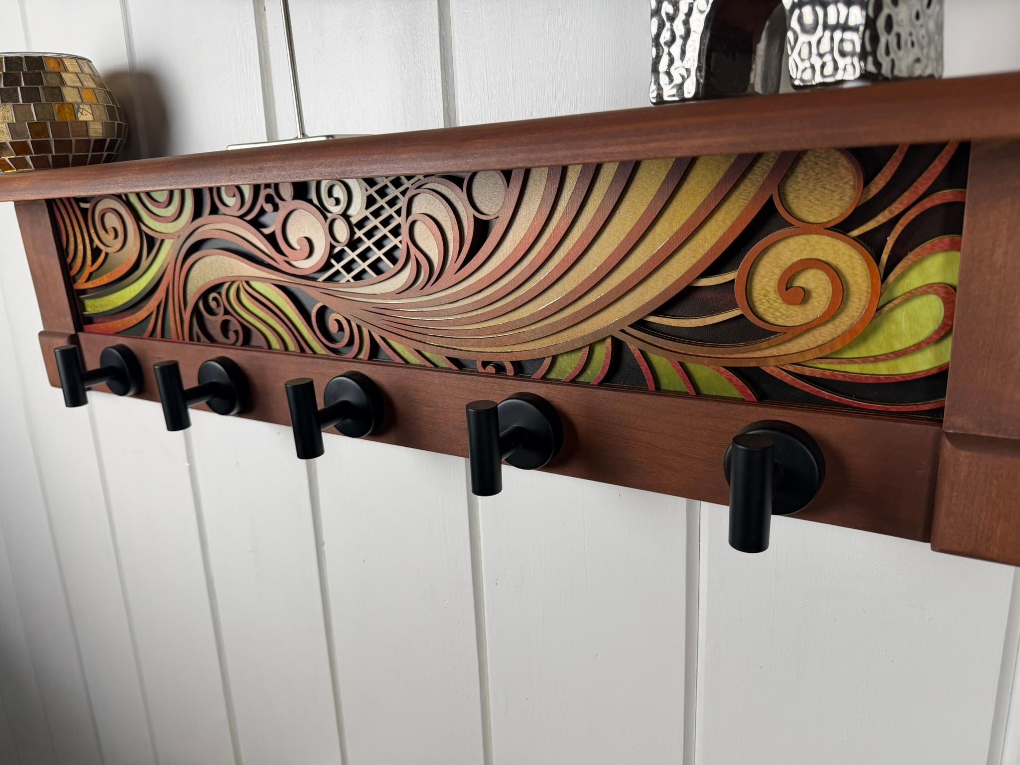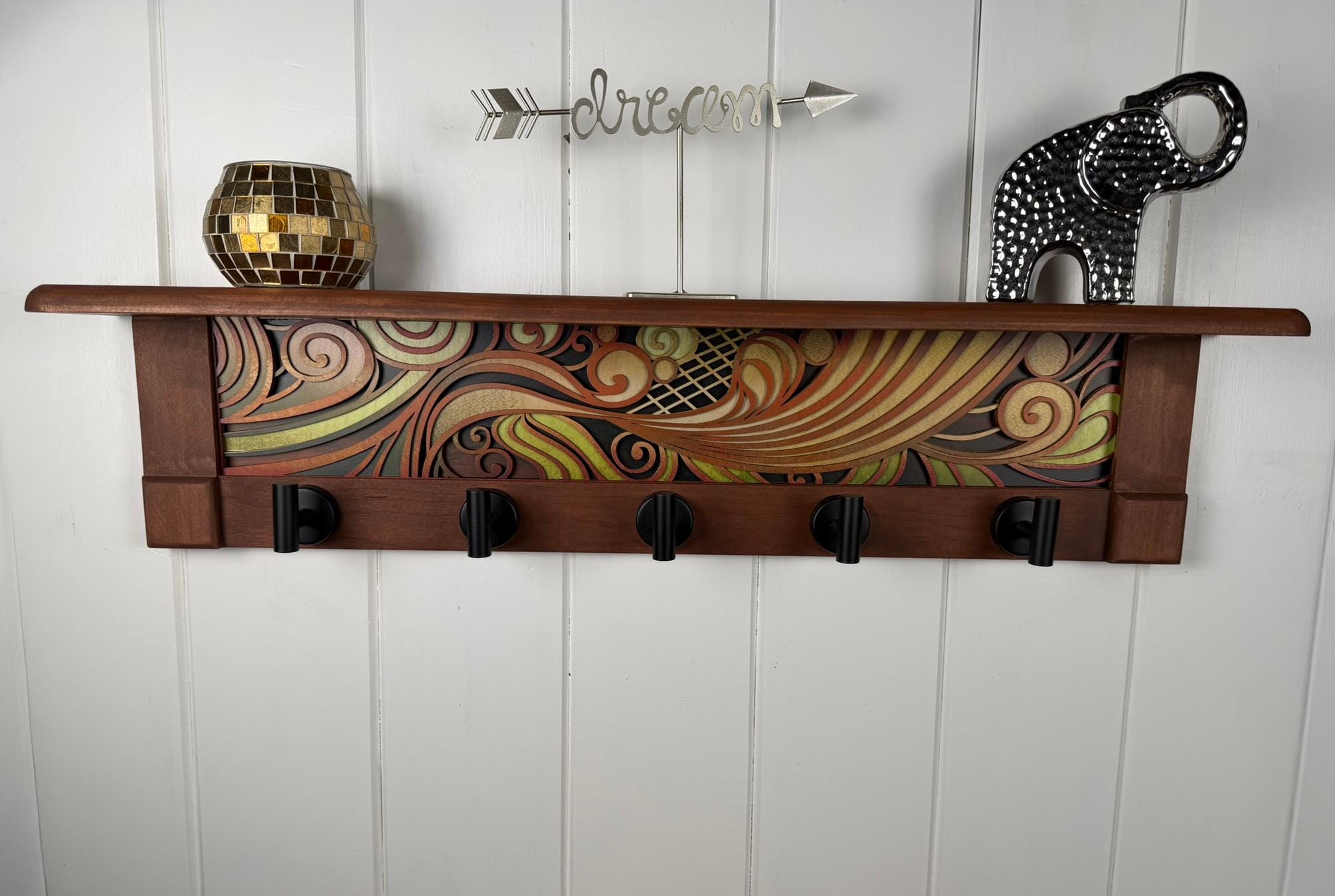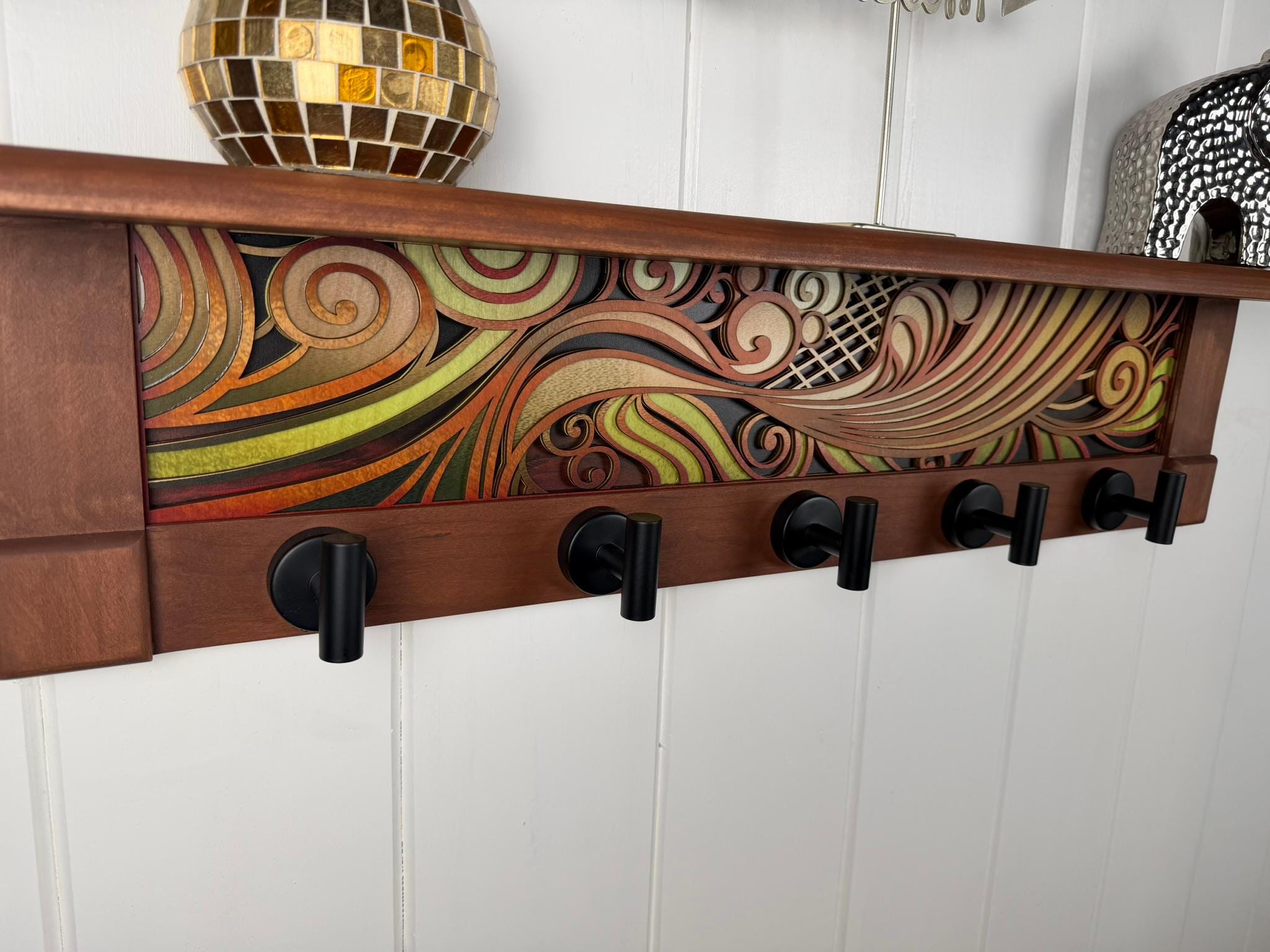 Bring color, rhythm, and modern craftsmanship to your space with this handcrafted abstract wave entryway shelf. Bold, swirling lines flow across a layered wooden panel—like wind, surf, and motion woven together—forming a vibrant kinetic centerpiece for your wall.