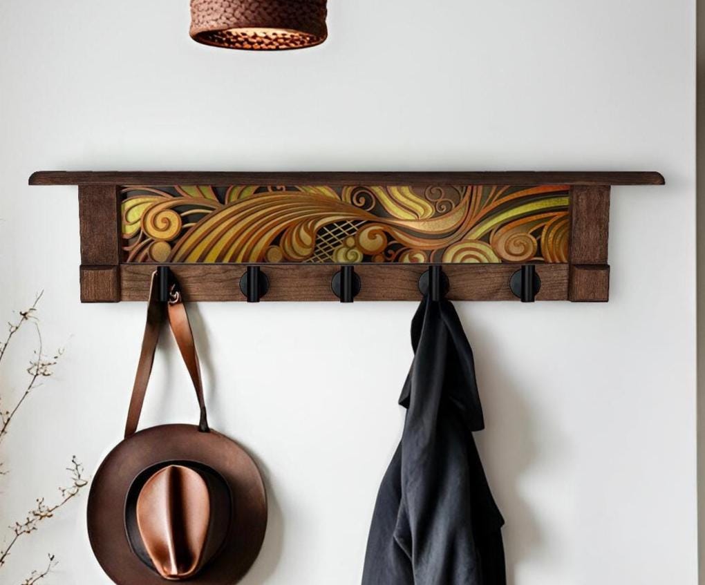 Featuring a row of sturdy hooks beneath the shelf, this piece is perfect for hanging coats, hats, and scarves, or displaying decorative items. Above, the generous shelf space offers an area to organize your essentials or showcase your favorite decor.