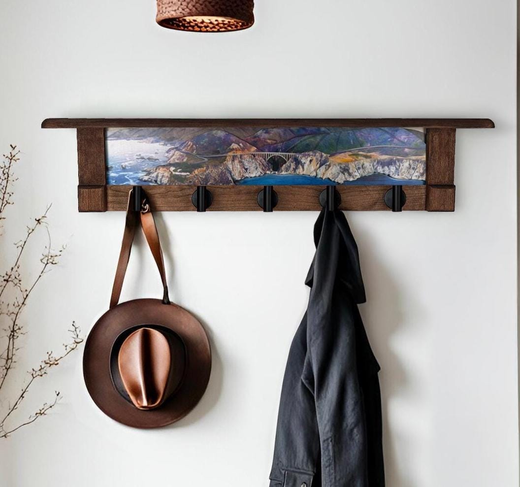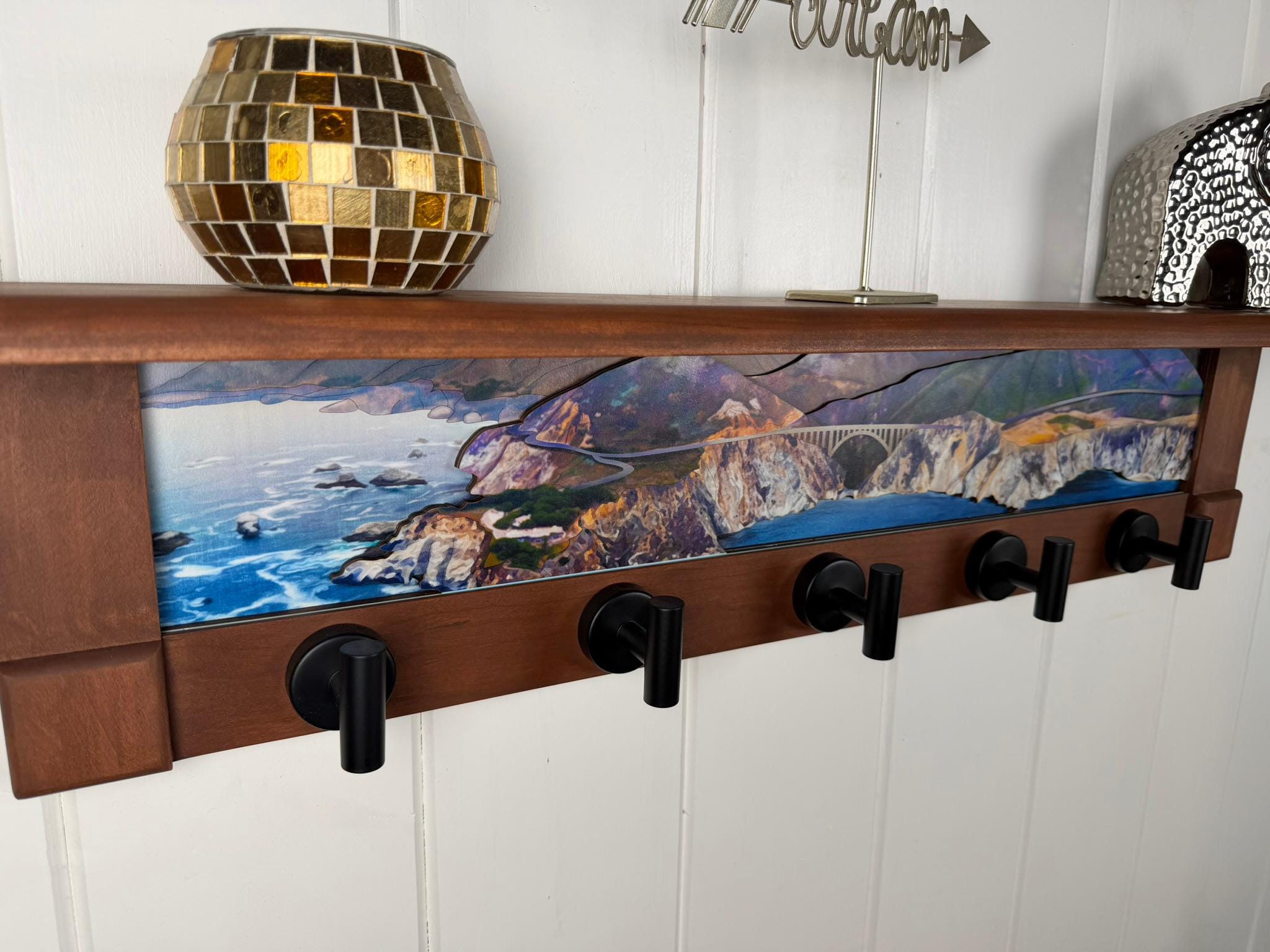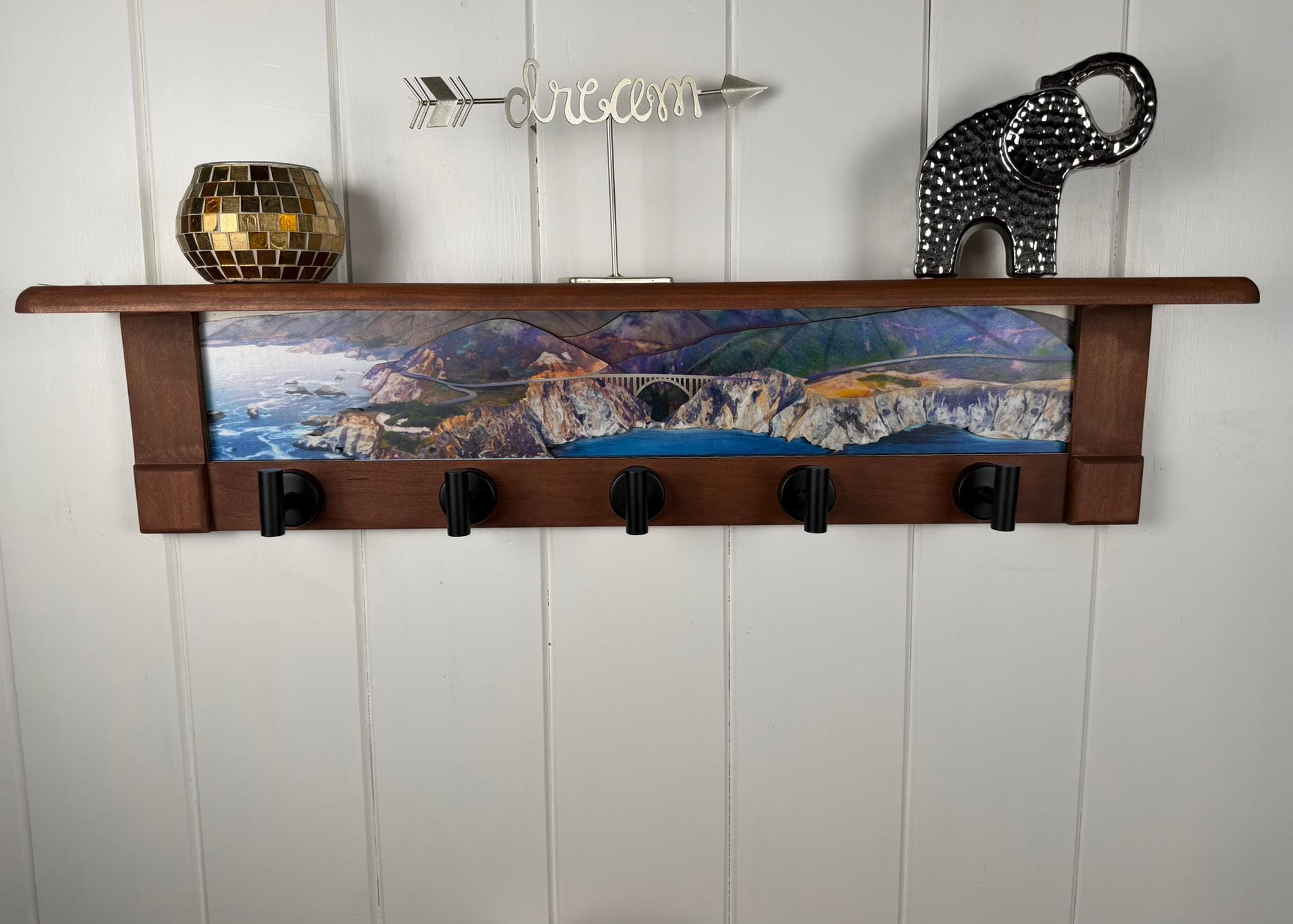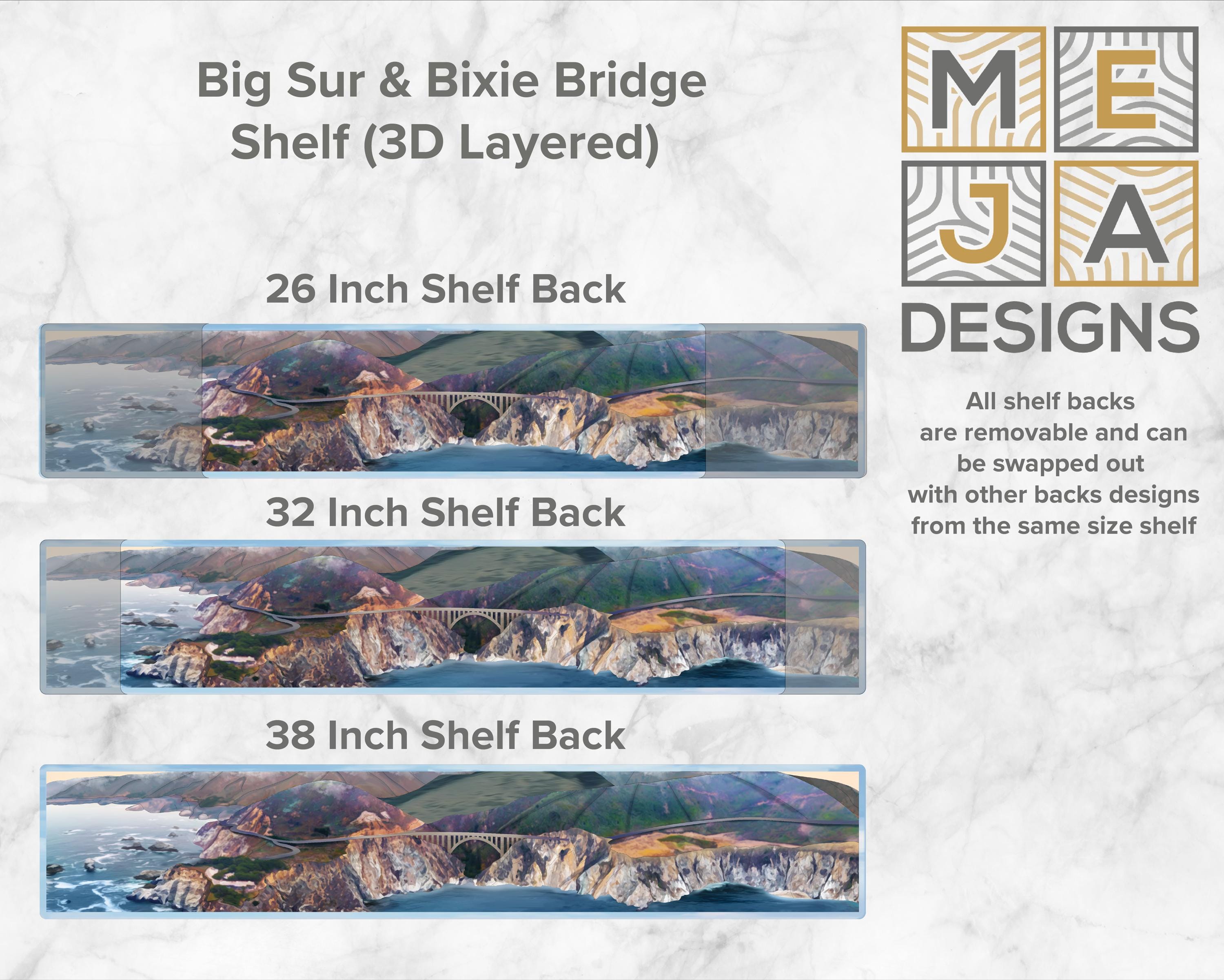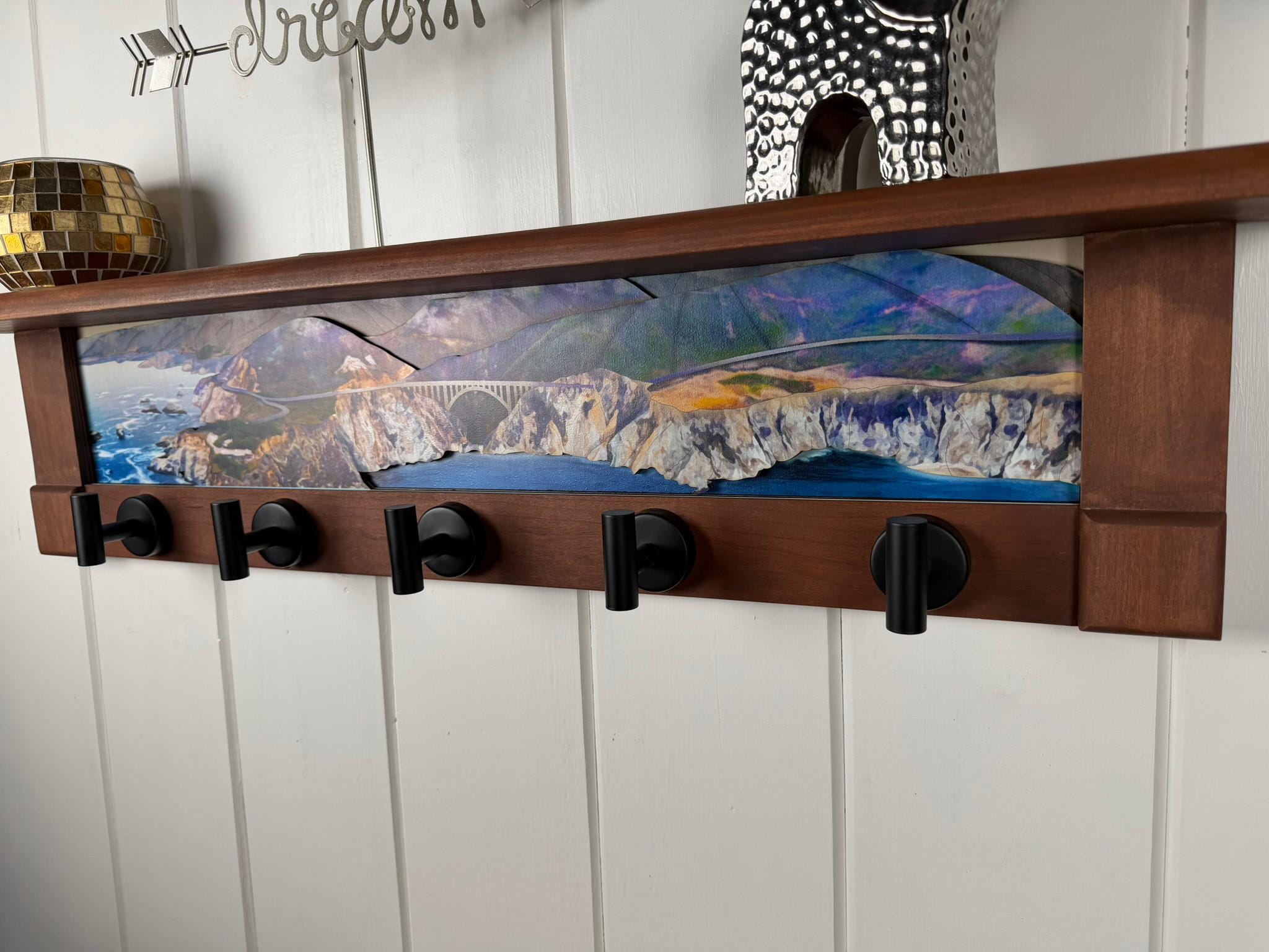 Bring the magic of California’s Big Sur coastline into your home with this handcrafted rustic wall shelf. A 3D layered wood rendition of the iconic Bixby Bridge sweeps across the back panel cliffs, ocean, and winding highway all stacked in depth, like a tiny road-trip view framed right in your entryway.