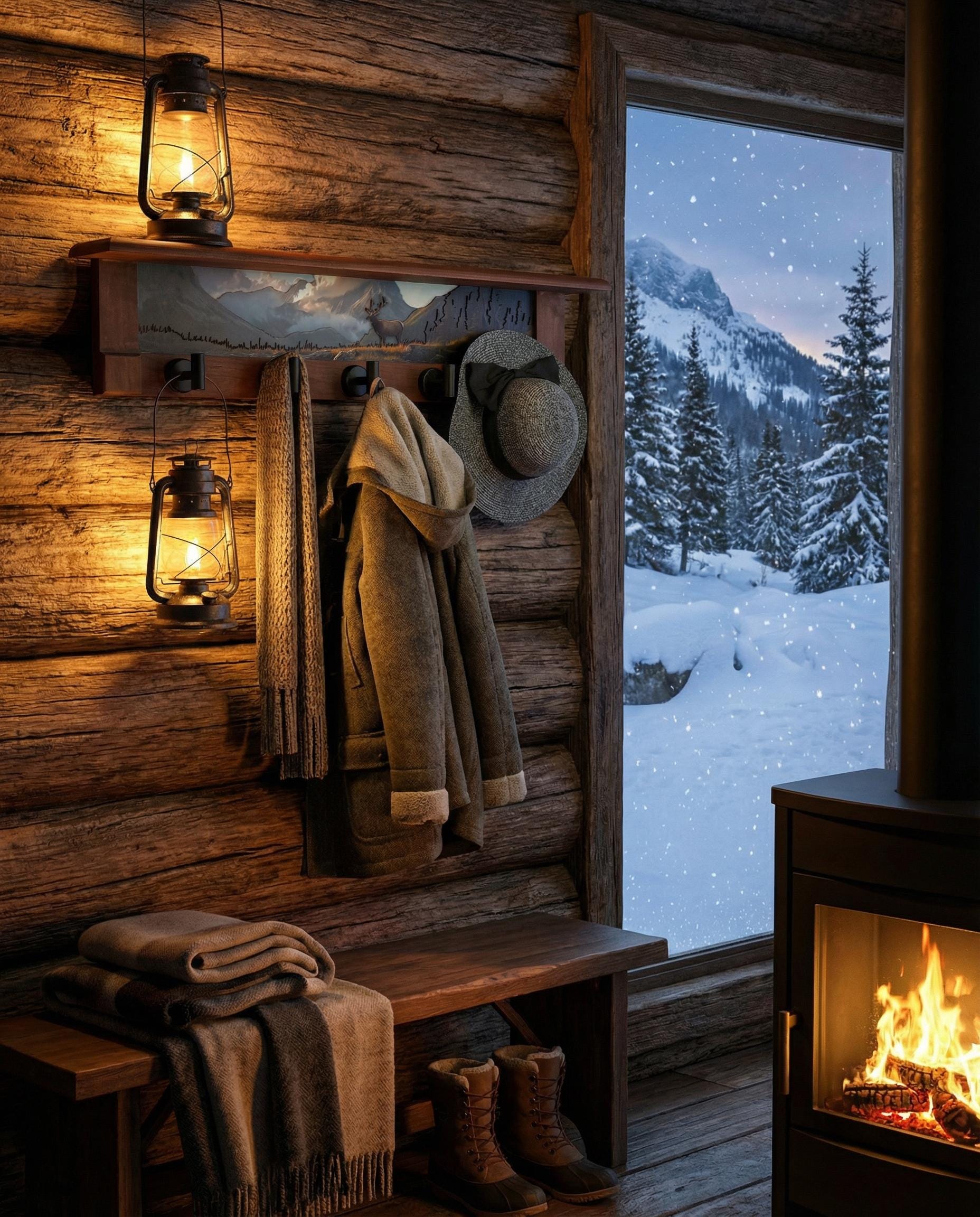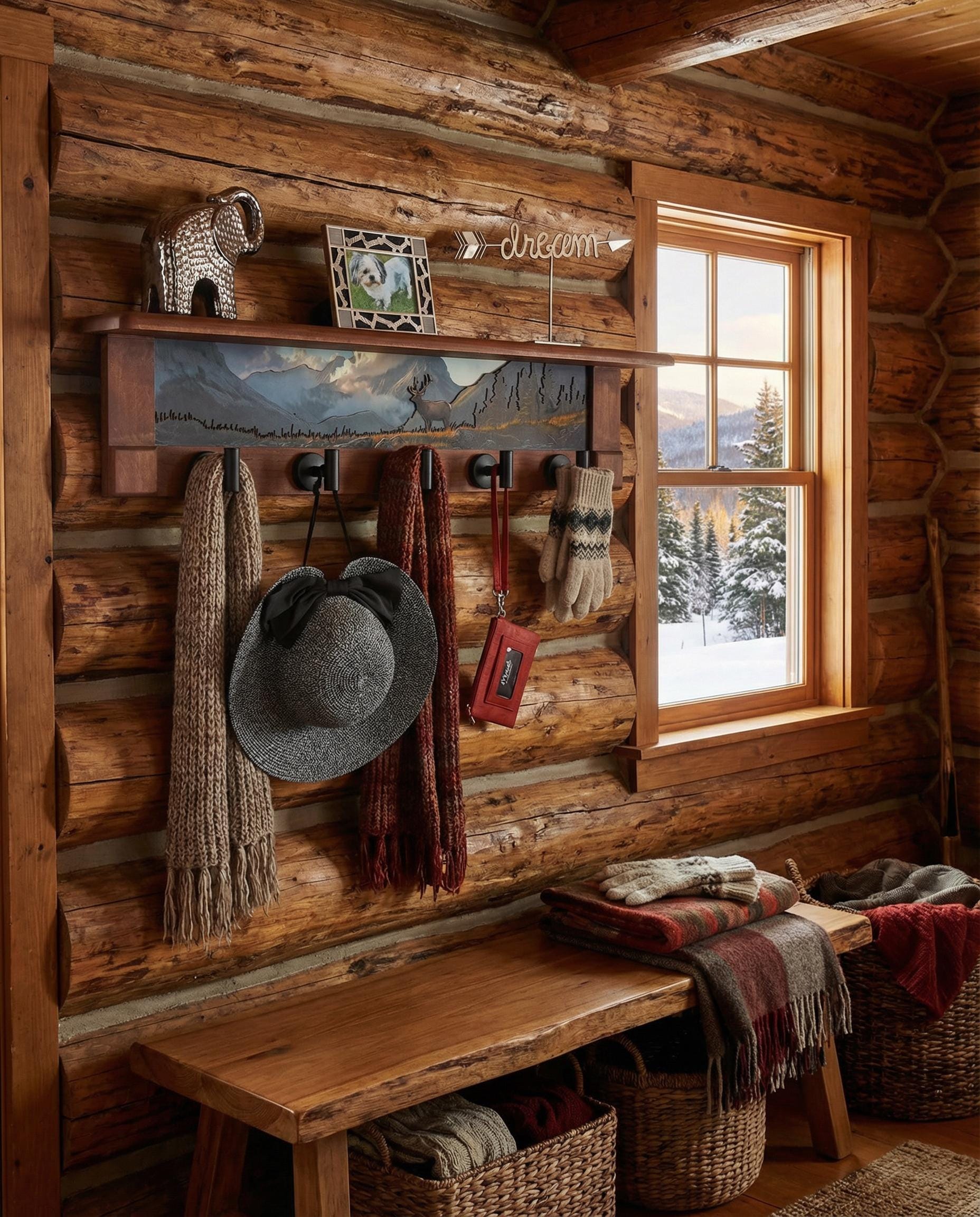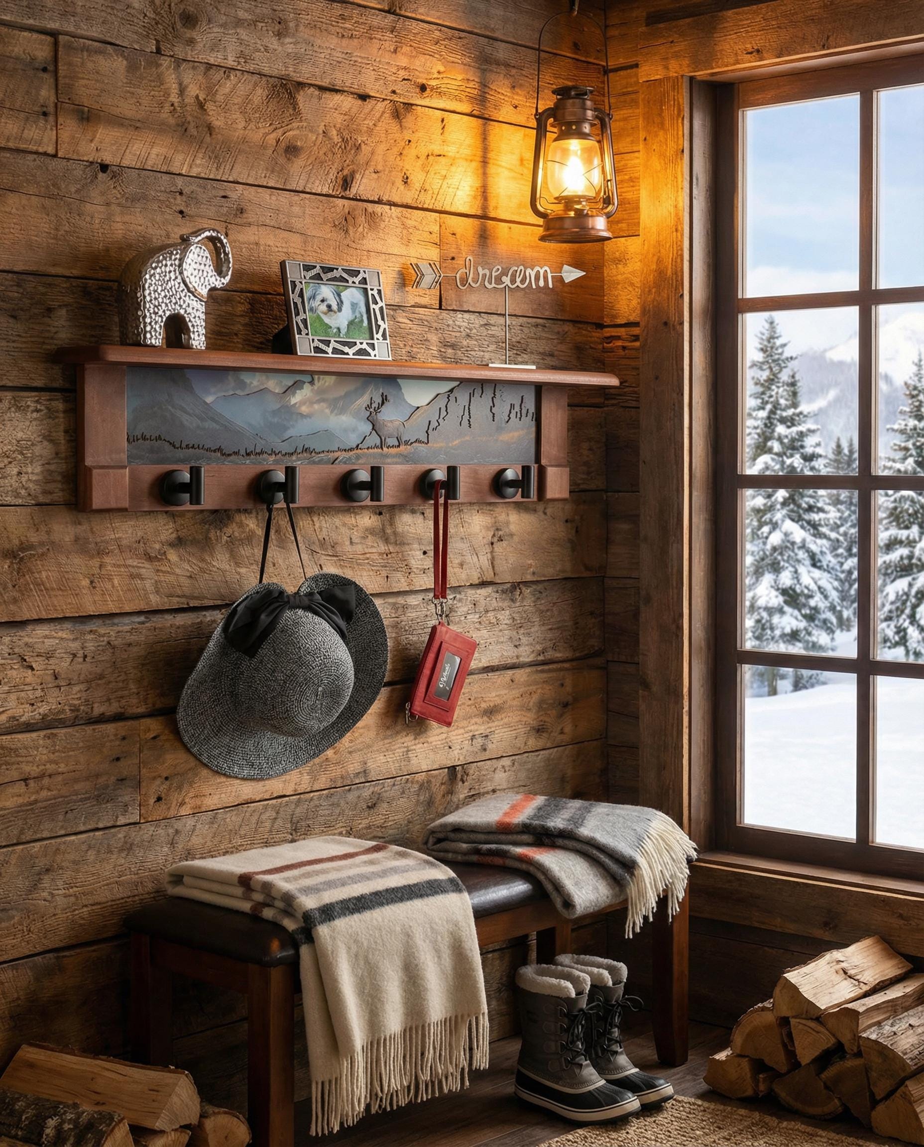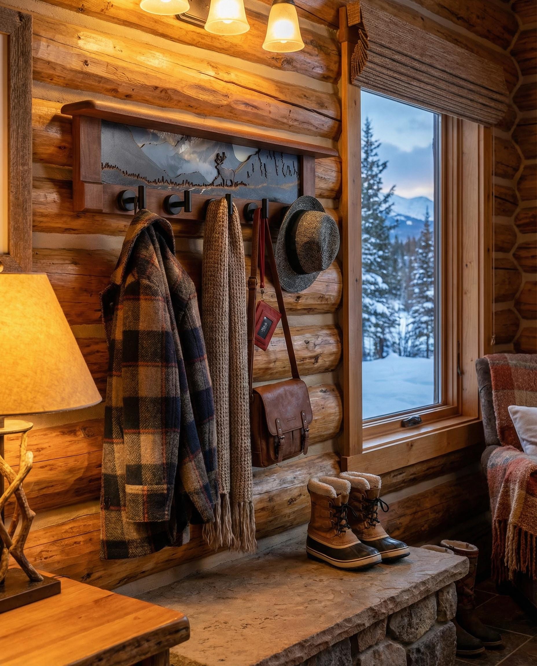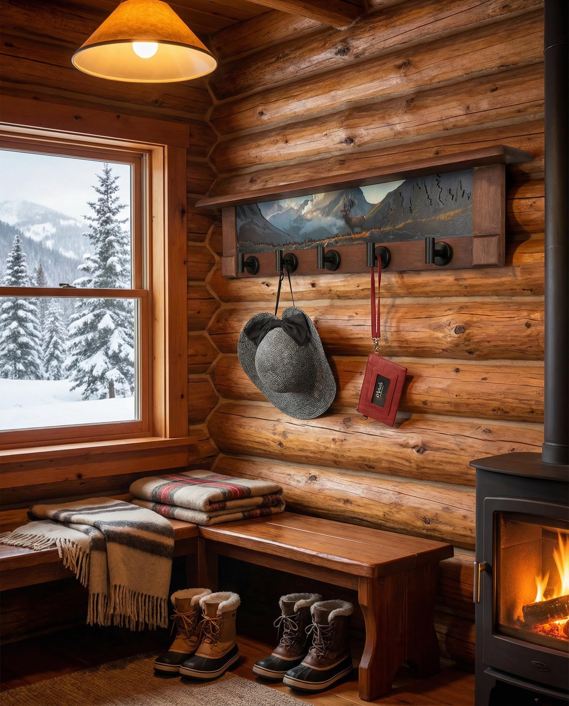 Rustic Wall Coat Rack with Shelf: Entryway Organizer with Black Hooks | Mountain Meadow Elk