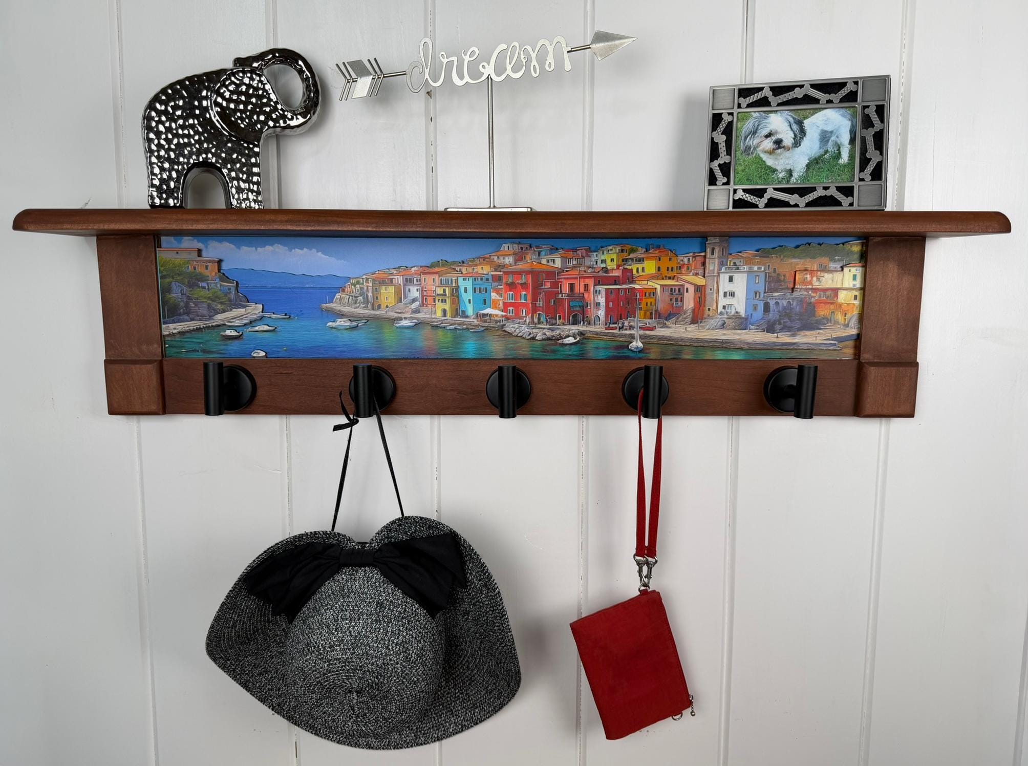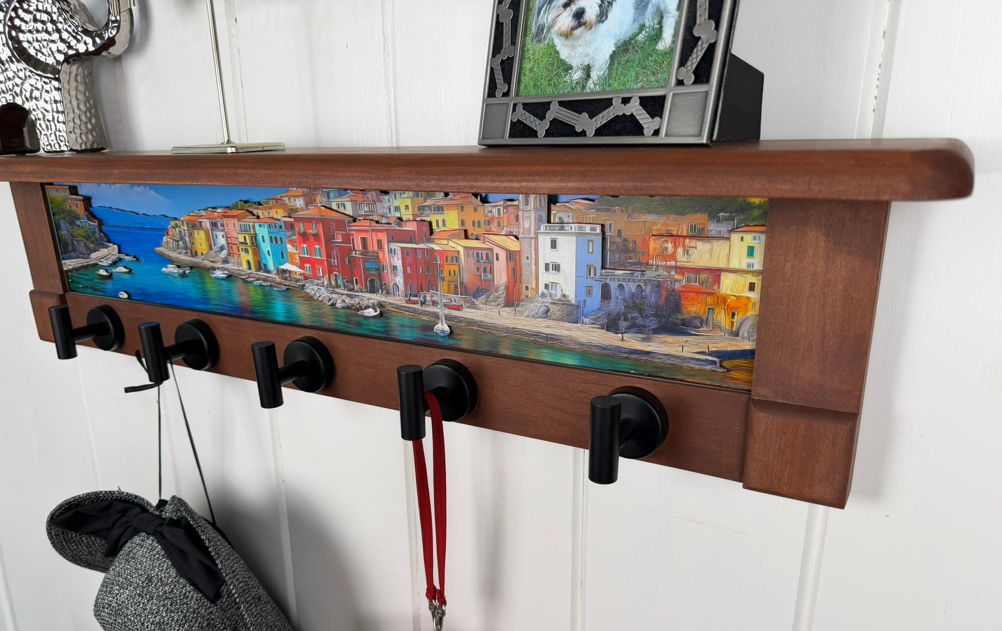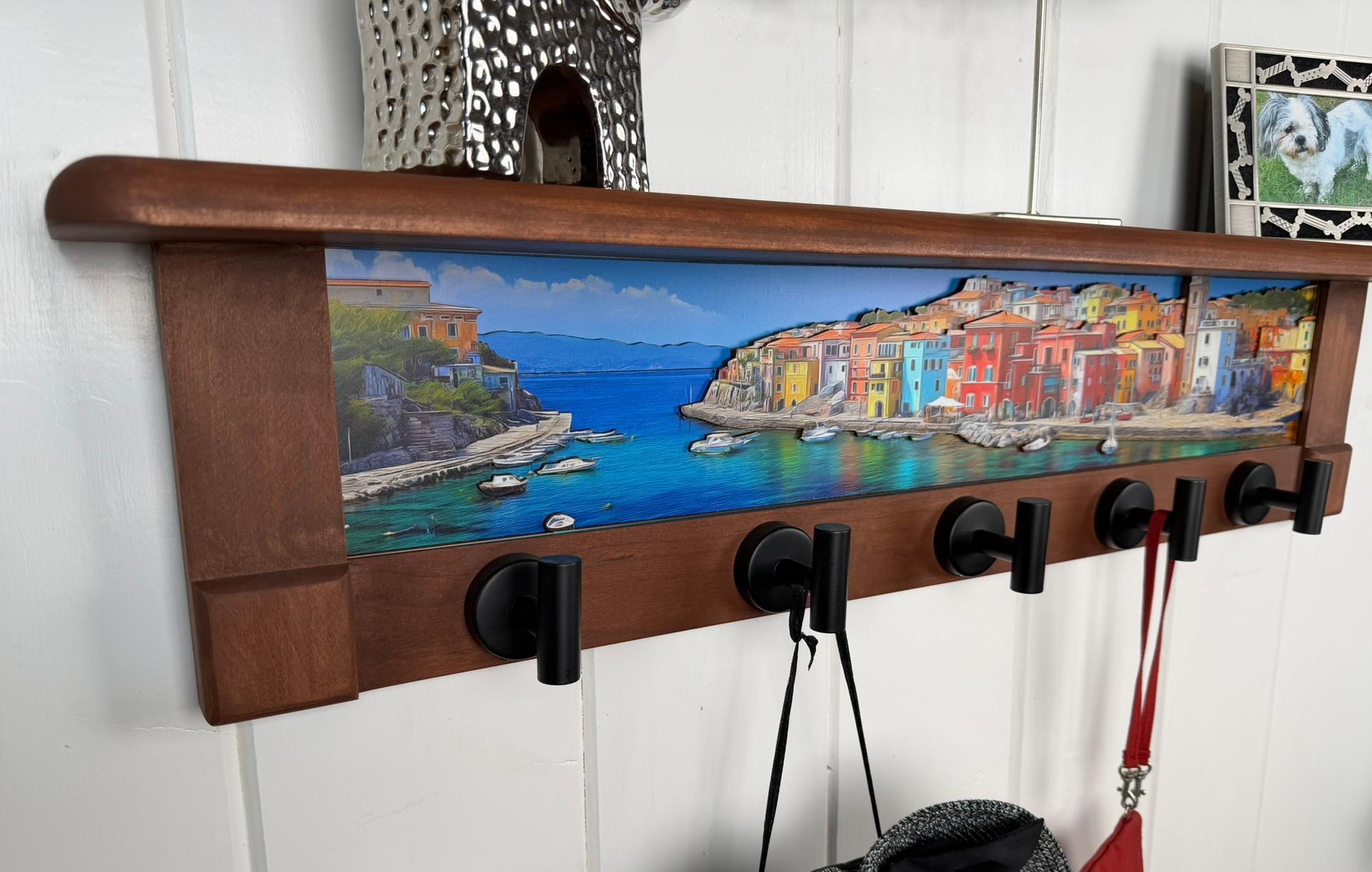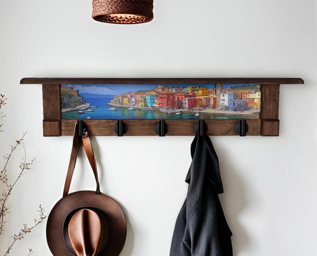 A warm, rustic wall shelf frames a sweeping coastal harbor scene with a deeper blue sea and expansive horizon. Colorful hillside buildings—painted in reds, yellows, blues, and soft neutrals—cascade down toward the waterfront, creating a lively village rhythm along the shore. The calm water stretches across the foreground, reflecting light from the sky and architecture, while small boats add quiet movement to the harbor. Fine layered outlines along rooftops, cliffs, and shoreline introduce a subtle 3D depth that brings the scene to life. Rich brown wood surrounds the artwork, grounding the bright coastal palette with a timeless, handcrafted feel. Below the artwork, matte black metal hooks are integrated into the shelf, blending everyday function with old-world coastal character.