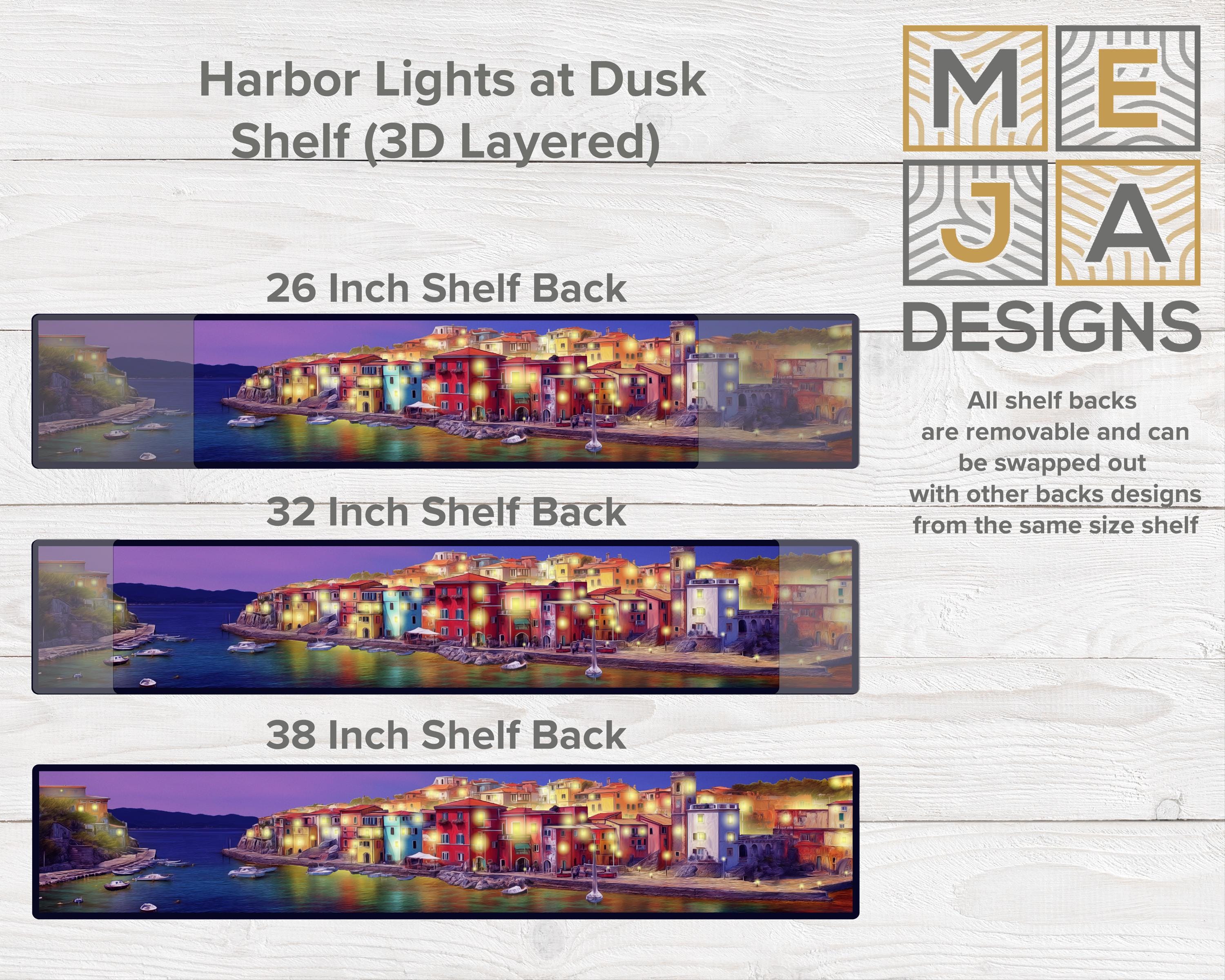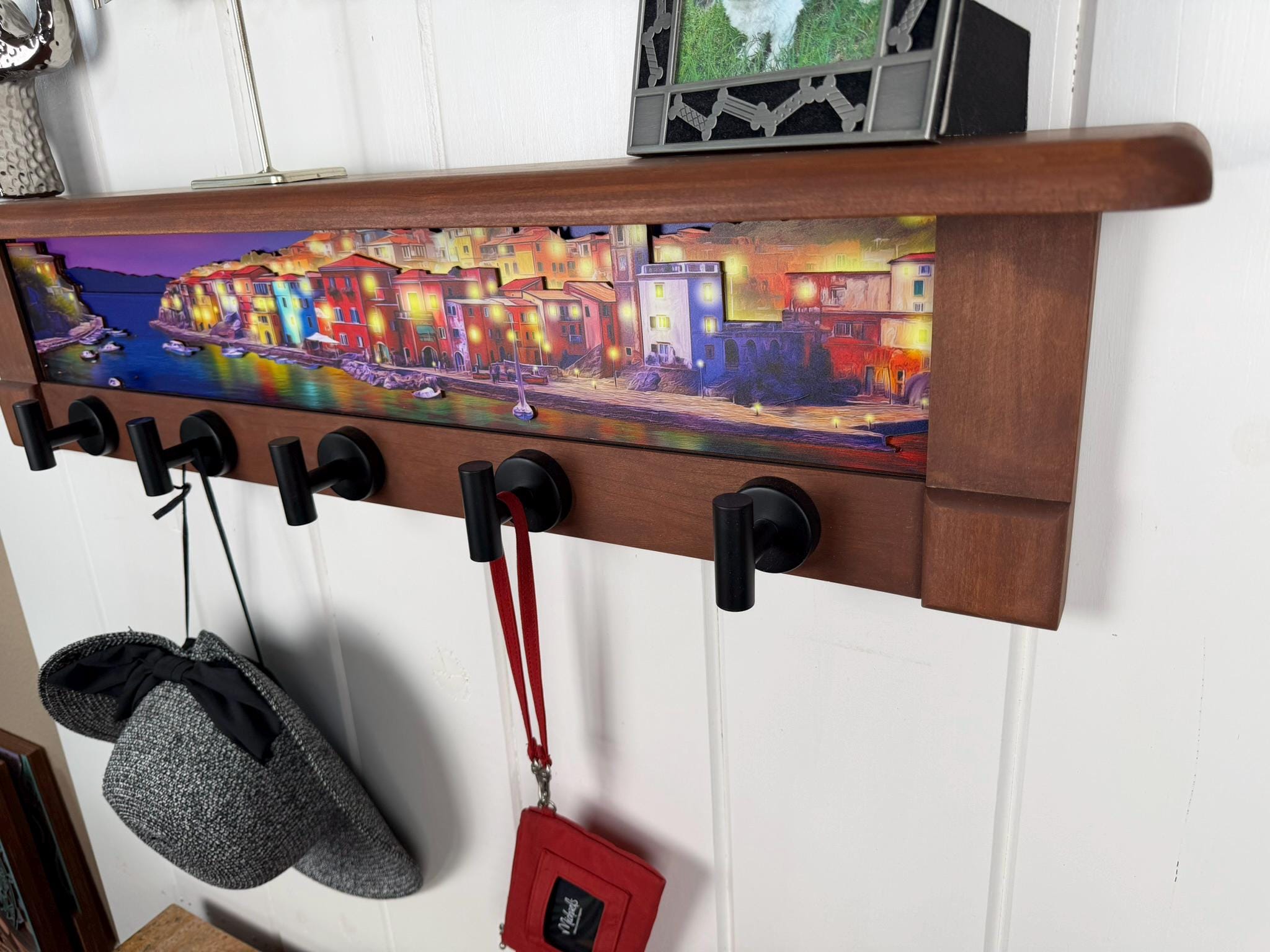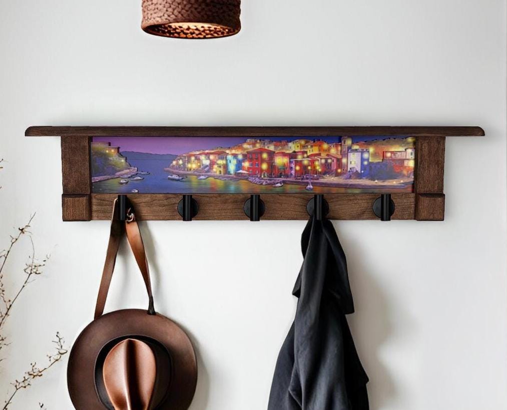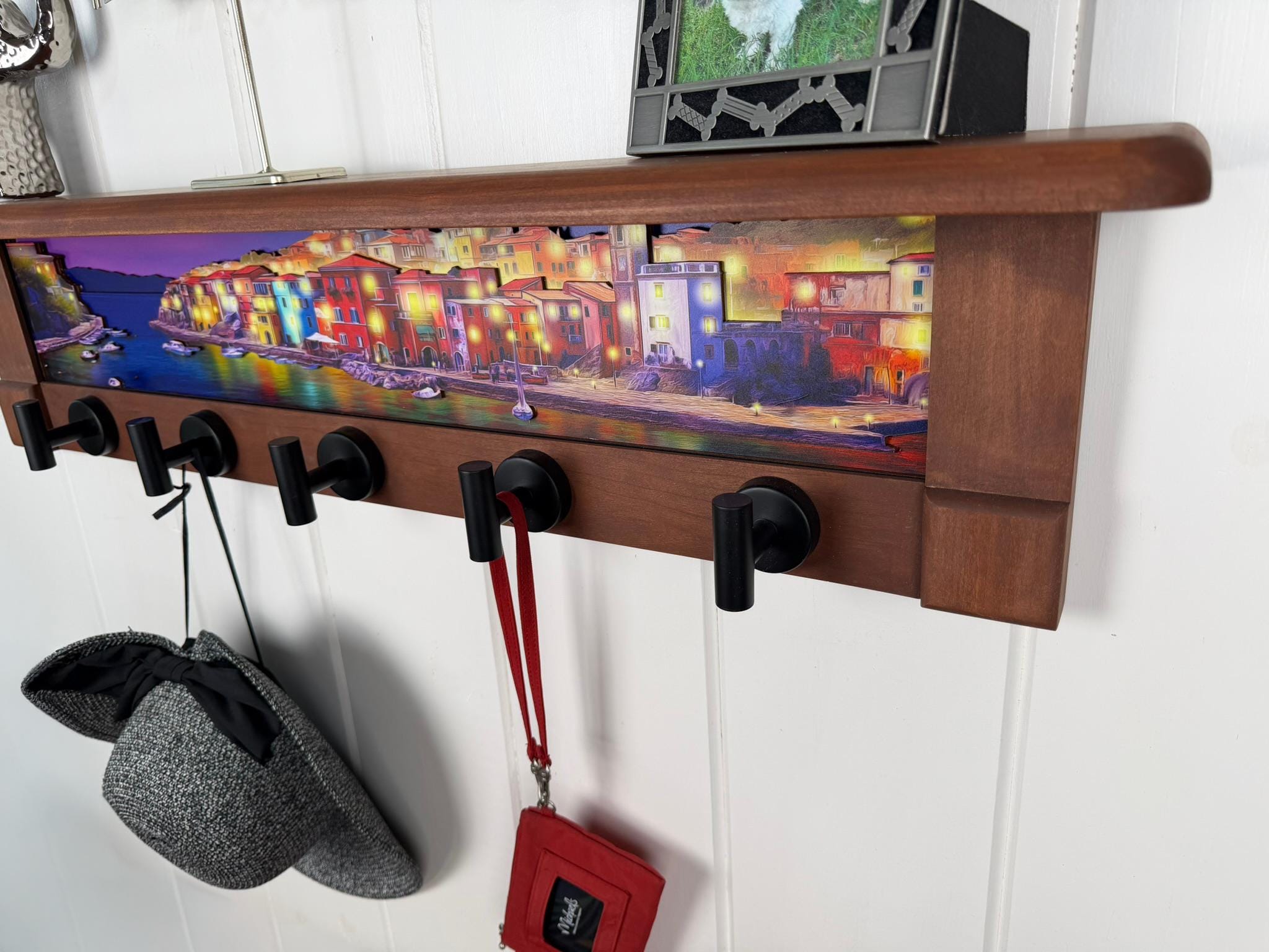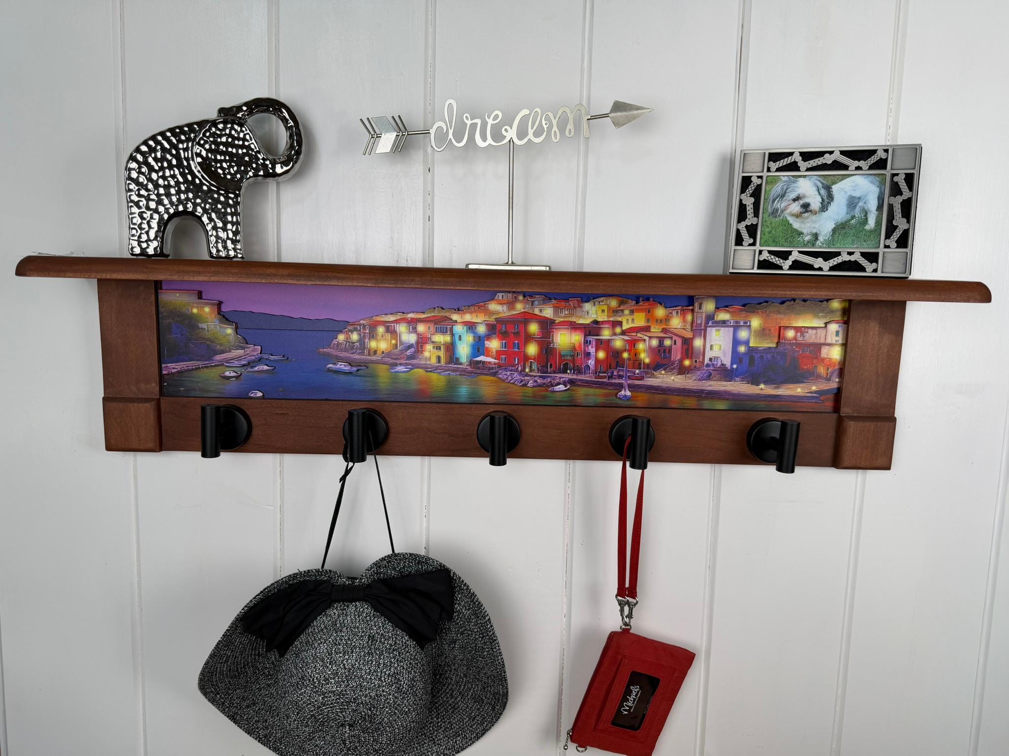 A warm, rustic wall shelf frames a twilight coastal village glowing under evening skies. Rich purples and deep blues settle over the harbor as colorful hillside buildings come alive with golden lights, reflecting softly across calm water below. The shoreline curves gently through the scene, with small boats resting in the harbor and cliffs fading into the distance. Fine layered outlines along rooftops, waterfront edges, and hills create a subtle 3D depth that adds richness and dimension to the artwork. The scene is set within solid brown wood, balancing vibrant color with a grounded, handcrafted feel. Below the artwork, matte black metal hooks are seamlessly integrated into the shelf, combining everyday function with atmospheric coastal style.