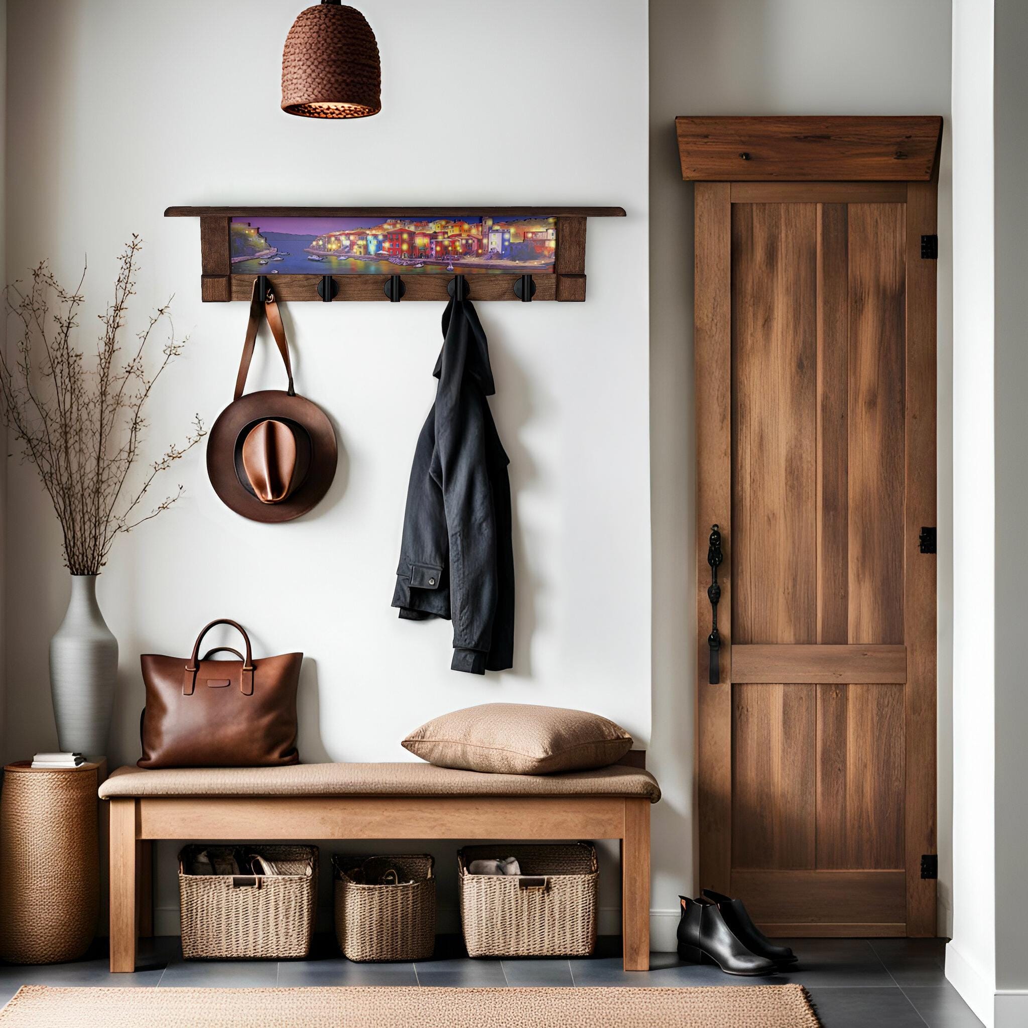 Functional Entryway Shelf – Rustic solid-wood shelf with a row of sturdy black hooks, ideal for coats, hats, bags, leashes, and towels.
